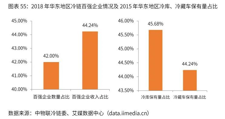總體來看,國內(nèi)冷鏈物流企業(yè)分布整體存在“東多西少”的態(tài)勢。從地域分布來看,按照百強企業(yè)數(shù)量,華東地區(qū)數(shù)量*多,占比42%;而百強企業(yè)收入占比則達到了44.24%,超過了數(shù)量占比,說明華東地區(qū)冷鏈物流百強企業(yè)收入水平高于平均值。2015年,華東地區(qū)冷庫及冷藏車保有量占比分別為45.68%及44.24%,2018年上半年,華東地區(qū)冷藏車數(shù)量增長占比為35%,在冷鏈物流設(shè)備上有一定的優(yōu)勢。